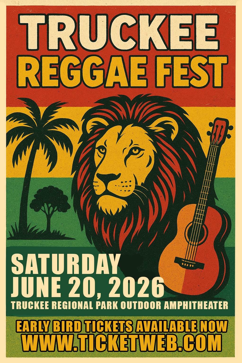 Truckee Reggae Fest 2026 (California, USA). A one-day, open-air, family-friendly reggae gathering at the Truckee Regional Park Outdoor Amphitheater in the Sierra Nevada. Expect internationally known reggae artists, an arts-and-crafts vendor market, food trucks, and a beer garden; past lineups have included Julian & Ky-Mani Marley, Barrington Levy, and more. The 6th annual edition is scheduled for Saturday, June 20, 2026.
